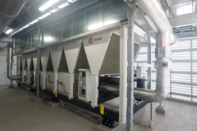 Delivered in partnership with builder Multiplex and Cooper & Oxley Joint Venture, the project featured a remote Central Energy Plant equipped with four 840kW air-cooled Trane chillers and dual-fuel Bosch boilers, supporting a chilled and heating water reticulation system. This system serviced the entire hospital complex, including operating theatres, isolation rooms, ICU spaces, and support areas. More than 30 AHUs, 218 VAV boxes, CRAC units, fan coil units, and 92 exhaust fans ensured zoned climate control across all departments.